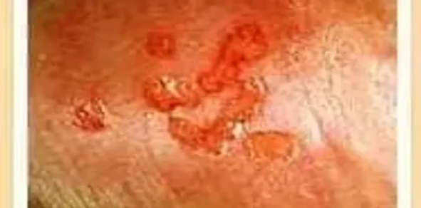 The symptoms of HSV-1 or HSV-2 may appear as a blister or as multiple blisters on or around affected areas — usually the mouth, genitals, or rectum. When the blisters break, they leave tender sores.
